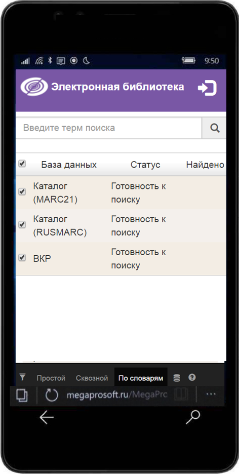 Работа с версией модуля «Электронная библиотека» для смартфонов производится с помощью web-браузера на мобильном устройстве из любой точки сети Интернет.