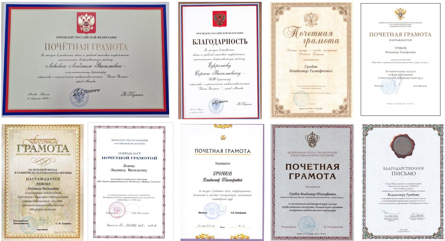 Многолетняя плодотворная деятельность специалистов ООО «Дата Экспресс» в области информационно-библиотечных технологий отмечена государственными и ведомственными наградами и поощрениями, а также дипломами, благодарностями и другими наградами профессионального сообщества.